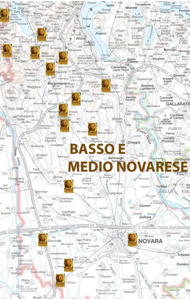 Lo studioso Donna D’Oldenico afferma che Briga “era situata lungo una via romana, poi francigena, e sin dal tempo di Liutprando (712-744) le fondazioni monastiche di chiese e cappelle rientrano nel quadro di ‘un profondo riordinamento della rete stradale romana’, sconvolta dall’impeto bellicoso dei barbari e quindi della creazione di quella rete di vie francigene dell’età altomedioevale sulla quale si svolse il movimento dei pellegrini e dei mercanti”. Briga era un territorio dominato nell’alto Medioevo dai conti di Biandrate-Pombia che furono protettori dell’Ordine Cluniacense a cui fecero munifiche donazioni, sostenendolo nella sua opera di riforma che favorì la fondazione di nuove celle monastiche, priorati e chiese, nonché la riorganizzazione della vita sociale ed economica in gran parte compromessa dalle invasioni ungare e saracene nel X secolo. Si può ipotizzare, in accordo con Donna D’Oldenico, che l’antica chiesa dedicata a San Tommaso (sec. XII) fosse stata realizzata dagli stessi monaci cluniacensi sostenuti dai conti di Pombia. “È quindi pensabile – scrive lo studioso – che i conti di Pombia siano stati coloro che, oltre ad averne la possibilità, abbiano avuto maggiore interesse a far costruire la chiesa di San Tommaso di Briga” sia “nell’intento di avviare, al termine delle scorrerie saracene ed ungare, la strutturazione religiosa e sociale di quel luogo facente parte del loro comitato”, sia perché rientrava nei loro obiettivi politici, in concorrenza e talvolta in ostilità con i vescovi e con il Comune di Novara, l’organizzare e controllare una strada che portava ai valichi dell’Ossola, valle allora in possesso del vescovo. Analizzando gli affreschi medievali dipinti nell’abside dell’antico oratorio, Donna D’Oldenico sostiene che questi, per alcune caratteristiche tipologiche, “furono eseguiti da monaci artigiani, (che) con ogni probabilità, appartenevano alla scuola di San Pietro in Ciel d’Oro di Pavia, monastero che nel momento in cui il controllo delle vie di traffico che portava ai passi alpini imponeva una vera gara tra vari monasteri, fu presente ed attivo nell’organizzare la via francisca dell’Ossola, lungo la quale, come già si è detto, fin dalla prima metà del X secolo possedeva corti e mansi, godeva di giurisdizioni e di regalie. Il cenobio di San Pietro in Ciel d’Oro, centro della riforma cluniacense in Italia, contribuì all’impianto monastico dell’Occidente e, a cominciare dal secolo IX, diede organizzazione economica e sociale alle terre delle due sponde del Ticino, ove lungo tutto il fiume troviamo abbazie, priorati, chiese e cappelle di origine benedettina. Così l’azione missionaria e sociale benedettina penetrò nelle valli che si aprono a lato del fiume e del lago Maggiore e pure nell’Ossola, lungo la quale si svilupparono anche le comunicazioni con il Vallese e l’Europa del Nord. (…) La strada dell’Ossola costituiva per Pavia un’altra delle strade che eludevano il monopolio milanese, ossia la barriera ‘sempre più esosa e sempre più ambiziosa costituita da Milano degli Arcivescovi. E arriviamo a Gozzano che è una delle porte che apre verso il Vergante, che si raggiunge passando da Invorio Superiore la cui chiesa parrocchiale è dedicata a San Giacomo. Poco distante da Gozzano, in direzione nord-ovest, sorge Soriso sulle pendici del monte Fenera che separa la bassa Valsesia dal Borgomanerese e dal Cusio. La parrocchia di Soriso dipendeva dalla chiesa plebana di Gozzano a cui nel 1180 versava le decime. Qui era stato edificato un antico oratorio dedicato a San Giacomo apostolo che è documentato a partire dal 1124, fu poi trasformato in cappella in castro, infine venne eletta a chiesa parrocchiale. Subì nel secoli successivi diverse ristrutturazioni e ampliamenti che trasformarono radicalmente l’antico edificio sacro. L’attuale chiesa parrocchiale non è anteriore al 1534, ma la struttura denota “segni di una fabbrica molto più antica”.. Sulla parete meridionale della chiesa, sotto il portico che abbraccia interamente la parrocchiale, si intravedono ancor oggi lacerti di affreschi databili al XV secolo che raffigurano San Cristoforo protettore dei pellegrini; sempre all’esterno, sopra la porta centrale ubicata ad occidente, si nota un piccolo affresco effigiante San Giacomo apostolo che risale al XVII secolo. All’interno della chiesa, sulla parete meridionale nell’attuale cappella del Crocifisso, si individuano degli affreschi antichi che raffigurano la Madonna allattante e un San Giacomo in abito da pellegrino con il bordone in mano. Nella cappella adiacente emergono ancora frammenti di un affresco che potrebbe rappresentare San Giacomo. Probabilmente questa parete apparteneva all’antico oratorio quattrocentesco di cui i due affreschi affioranti sono la testimonianza artistica. Nel 1730 il pittore Tarquinio Grassi arricchì il presbiterio con alcune opere narranti episodi della vita di San Giacomo. Da Soriso, seguendo antiche tracce viarie, si può raggiungere Boleto la cui parrocchia è dedicata a San Giacomo. Da Boleto, scendendo verso il lago d’Orta, prima di imbarcarsi in direzione dell’Isola di San Giulio, i pellegrini facevano una tappa presso l’oratorio di San Giulio, situato tra Opagliolo e la Punta di Casario, immerso nel verde dei boschi in una stretta valletta che conduce al lago. In questo oratorio è affrescato un San Giacomo accanto alla Madonna e a San Giulio.